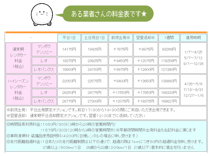 しかし2日借りると料金が2倍になってしまうので、表の「前夜出発」というのを使うといいでしょう。